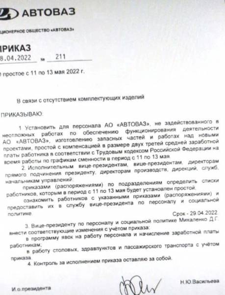 Конвейер Lada вновь встал – на этот раз больше, чем на две недели. Согласно приказу исполняющей обязанности президента АВТОВАЗА Натальи Васильевой (Николя Мор покинул Россию и сейчас находится во Франции), завод не будет работать все майские праздники, а также межпраздничные дни, которые будут оплачены как простой в размере 2/3 средней зарплаты. Фотографией приказа работники завода поделились в соцсетях.