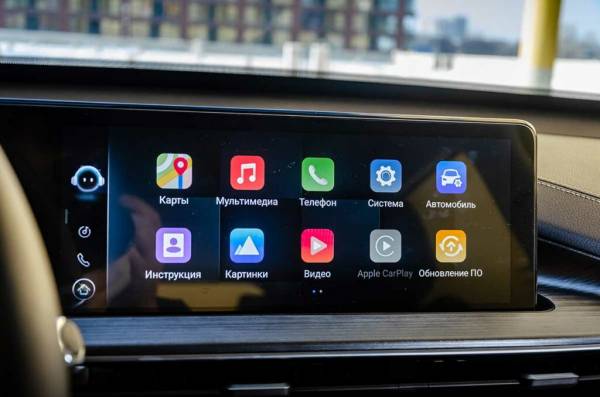 Первое, что цепляет взгляд, — широкая единая панель из двух 12,3‑дюймовых дисплеев приборной панели и медиацентра. Графика у экранов классная. Картинка с камер хорошая. Функционал широкий: есть Apple CarPlay и Android Auto. Отзывчивость сенсора на прикосновения неплоха. И только блики от солнца досаждают.