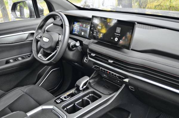 Глеб настолько подробно рассказал про «Окаванго», что и добавить особо нечего. Но я постараюсь: все-таки за рулем провел больше месяца. Но, как показывает пример Глеба, который составил мнение о машине, проведя в ней всего пару часов, первые ощущения — они самые правильные. И я их прекрасно помню. Когда забирал этот кроссовер с парковки пресс-парка, то сразу обратил внимание на маленькие колеса. Тогда я подумал, что, наверное, комплектация не максимальная, и уж в «топе» колеса будут нормального размера. Но каково же было мое удивление, когда на боковине шины я увидел надпись R19! И да, машина была в «максималке». Следующий кадр: я сажусь в черный «кожаный» салон и удивляюсь его аскетизму. Как же так? У обновленного Geely Coolray, который стоит в полтора раза дешевле, салон выглядел богаче! Что это за торчащий планшет, и где амбиентная подсветка, которая могла бы разбавить эту черноту?