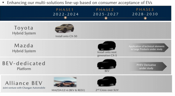 На первом этапе (2022–2024) уже были представлены большие кроссоверы с мягкогибридными и подзаряжаемыми (PHEV) установками, такие как CX-90, которые в первую очередь нужны компании для увеличения прибыли в как можно более короткие сроки. На втором этапе (2025–2027 гг.), заявляют в Mazda, произойдет «переход к электрификации» перед третьим этапом (2028–2030): именно тогда состоится уже «полномасштабный запуск» электромобилей — и, по всей видимости, полный отказ от моделей с ДВС (по крайней мере, так в теории).
