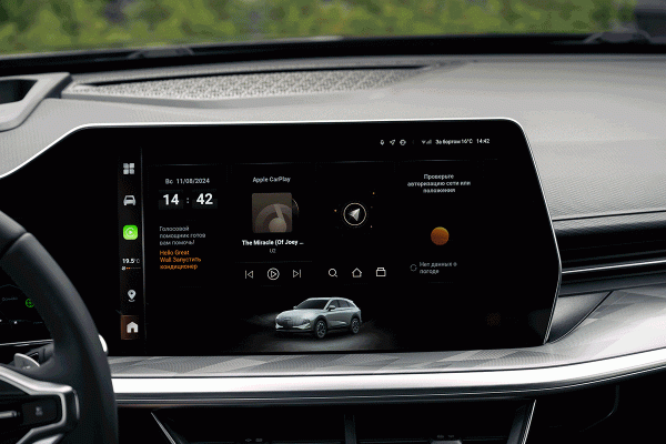 Но, то, что этот кроссовер обращает на себя внимание, я убедился лично, когда на трассе М-12, к нам пристроился свежий BMW X6 и некоторое время шел параллельным курсом. Его водитель и передний пассажир с явным интересном разглядывали китайскую новинку. Причем не только снаружи, но и старались заглянуть в салон! Здесь их внимание явно привлекла единая мультимедийная панель, включающая 12‑дюймовые виртуальные приборы и развернутый к водителю 14,2‑дюймовый центральный дисплей. По своему функционалу эта система даже круче, чем в новых «баварцах». В нее интегрированы «Яндекс Музыка» и «Яндекс Навигатор», причем карту с навигацией можно вывести на приборную панель, а подсказки маневров — на проекционный дисплей. Однако на панели приборов видна не вся информация: на карте нет дорожных камер и текущей скорости по GPS, а знаки ограничения скорости отображаются только те, что фиксирует камера под лобовым стеклом.