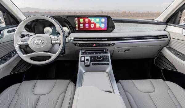 Наиболее заметные метаморфозы в интерьере Hyundai Palisade касаются торпедо. Дефлекторы вентиляции теперь визуально представляют единый блок, протянувшийся от правой двери до приборной панели. Виртуальные приборы теперь имеют новый дизайн, а медиацентр – 12,3-дюймовый экран вместо прежнего 10,25-дюймового. Еще Palisade получил новый руль, опциональное кресло водителя повышенной комфортности, подогрев кресел третьего ряда, видеозеркало заднего вида, беспроводную зарядку увеличенной мощности и разъемы USB-C.