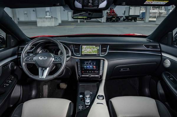 Салон QX55 скроен из приятных дорогих материалов. Хотя выпуклый дизайн уже воспринимается устаревшим. Единственный раздражитель — слабый по функционалу и графике медиацентр с двумя экранами.