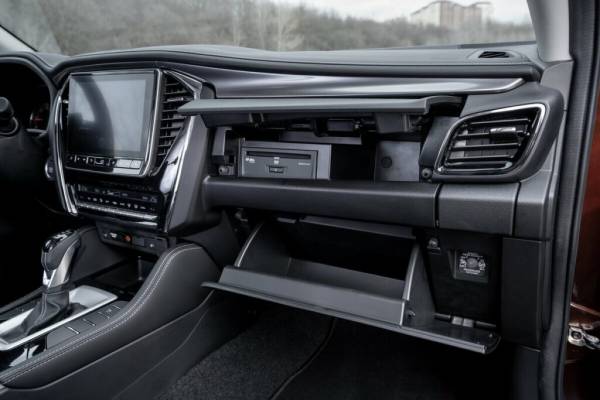 На торпедо два бардачка, но в максимальной комплектации половину верхнего отсека занимает блок DVD проигрывателя: он идет «в нагрузку» к медиацентру с 9-дюймовым экраном и отказаться от него нельзя. При этом есть здесь и весьма удачные эргономические решения, в виде выдвижных подстаканников под боковыми дефлекторами обдува (зимой напитки греет печка, а летом охлаждает кондей) или расположенной поверх торпедо большой кнопки «аварийки». Хорош и блок климат-контроля с удобными клавишами под длинным монохромным дисплеем.