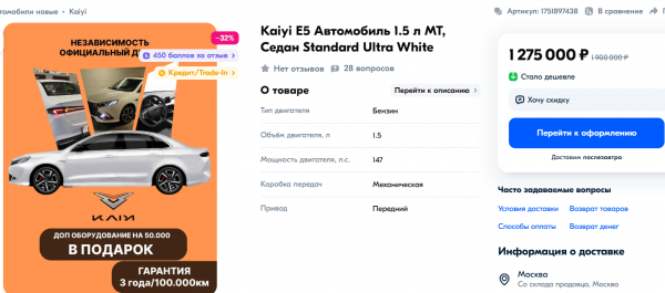 На маркетплейсе Ozon начали продавать новый седан Kaiyi E5 калининградской сборки по цене Lada Granta: автомобиль доступен к покупке за 1 275 000 рублей — без каких-либо дополнительных условий!