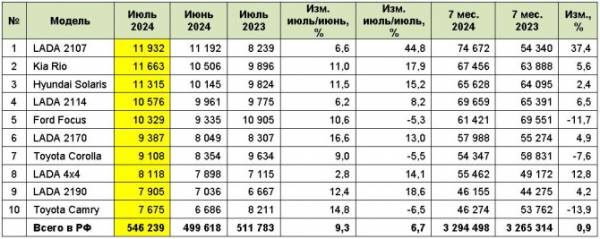 По отношению к июню текущего года все марки из Топ-10 показали положительную динамику, причём «Лады» показали самый значительный рост +25,7%.