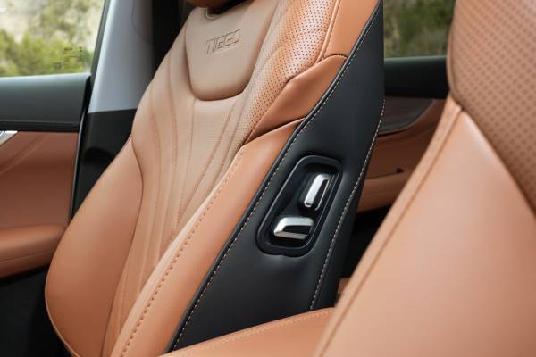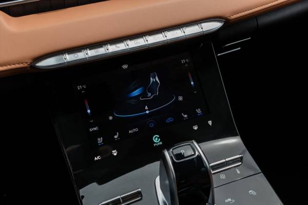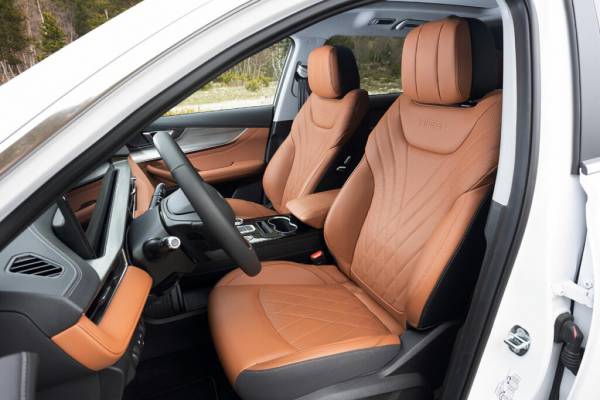 Про саму езду. Трогаешься на мягких лапах, работают только электродвигатели. Слышно непривычное шуршание — включается «отпугиватель пешеходов». Звук так себе; конечно, не игра Шерлока на скрипке, но и не вальс Шопена в исполнении автора. К такому звучанию привыкаешь и через какое-то время перестаешь обращать внимание на эти синтезированное шумы. Когда скорость набрана, акустика совсем другая. Старт приятный, с хорошим наполнением, уверенный и быстрый, даже если направился в гору. Он настолько плавный, что энергетика ускорения не передается телу, и несмотря на реальные 7,5 секунды до сотни, ощущается предательски размеренным. Сразу в голову настойчиво постукивает мысль: а ведь он едет по-другому, совсем не как обычные Tiggo 8 Pro или Pro Мах. И динамика здесь ни при чем — автомобиль намного устойчивее старших братьев. Боковая раскачка минимальна, килевой не ощущается вообще, хотя горная дорога щедра на перепады. Что это — другая подвеска? Нет, ее не меняли, ну если подкорректировали настройки, то самую малость. Затем понимаешь: все дело в лишнем весе — вот когда это настоящее благо. Причем сама батарея весит далеко не тонну, а всего каких-то 134 кило, а клиническая картина совсем другая — центр тяжести сместился вниз. Про неподрессоренные массы можно не вспоминать.