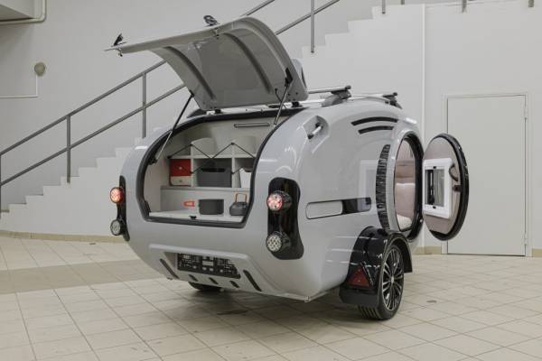 Автодом-капсула Feria представляет собой модное пространство для любителей активного отдыха и автотуризма. Это передвижной жилой модуль для двух взрослых и ребенка на базе одноосной рамной конструкции c монолитным кузовом, каркас которого выполнен из сэндвич-панелей и обшит стеклопластиком по бесшовной технологии. Салон выполнен из композитных панелей с обивкой из ткани и облицовкой из пластика. Здесь расположены спальное место для комфортного сна двух взрослых с беспружинным матрасом шириной 140 сантиметров, а также с подстаканниками и USB-розетками в изголовье. Для ребенка предусмотрено дополнительное спальное место. Панорамное окно покрыто бронированной пленкой, защищающей его от царапин. В задней части кузова расположена кухонная зона: рабочая поверхность и полки для хранения кухонных принадлежностей. Доступ к ним обеспечивается снаружи с помощью подъемной задней двери прицепа. В боковых дверях имеются тонированные форточки с москитными сетками и шторами плиссе.
