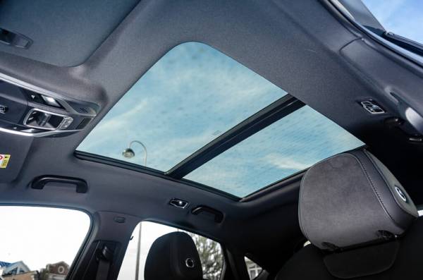 Потолок отделан темной тканью. Панорамная крыша существенно добавляет света и воздуха темному салону.