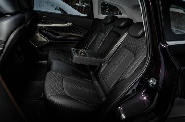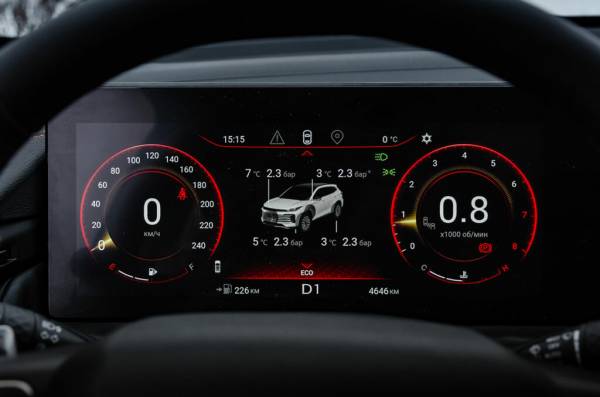 В салоне окружает поразительная технологичность: доминанта передней части салона — два широкоформатных дисплея 12,3 дюйма (правый — сенсорный). Графика обоих дисплеев прорисована на высшем уровне. Зона управления климат-контролем также сенсорная, на ней располагаются функции кондиционирования, ионизации воздуха, обогрева и обдува сидений. Отмечу, что все сенсоры работают идеально — чутко и без задержек. Центральный тоннель, удачно стилизованный под алюминий, выглядит красиво и практично — поцарапать или повредить его случайно не получится. На нем расположились беспроводная зарядка, тачпад и бесконечные функции нашего технологичного «китайца».
