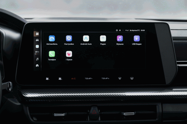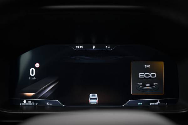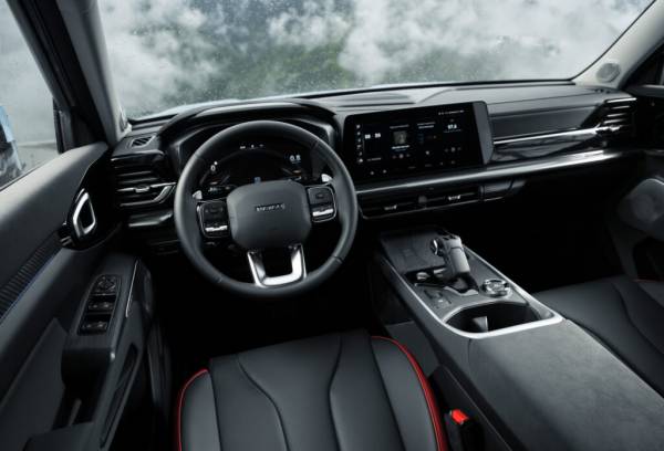Цифровая приборная панель (с хорошей антибликовой защитой) и дисплей мультимедийной системы имеют размер 12,3 дюйма по диагонали. Физических кнопок управления функциями нет, но есть и интересные решения. Так, управление климатической установкой осуществляется с помощью сенсорных кнопок в нижней части дисплея мультимедиа. Неплохо, но требует привыкания. На центральной консоли — селектор АКП, такой же, как и на Tank 300, «шайба» выбора режимов движения (в полноприводной версии их пять, в переднеприводной — четыре), кнопка запуска двигателя и клавиша электрического стояночного тормоза.