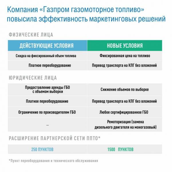 Компании, владеющие собственным автопарком, также получат поддержку. Они смогут фактически бесплатно оснастить машины ГБО. Заплатить придется только за работы по монтажу, а само оборудование будет предоставляться в аренду на срок до 5 лет с минимальным платежом. При покупке определенных договором объемов метана стоимость кубометра газа с учетом арендных платежей будет практически таким же, как и его розничная цена. По истечении срока аренды компания сможет выкупить ГБО за 2% его стоимости. Но переоборудовать машину можно и вообще без каких-либо затрат со стороны клиента – если он разместит на своих машинах рекламу, популяризирующую использование метана как топлива для автомобилей.