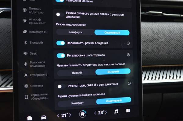 Порадовала беспроводная интеграция с Apple CarPlay. Ну а голосовой помощник — не более чем игрушка для детей. Мне несложно и самому нажать на кнопку открытия люка или стекла двери, да и будет это быстрее, чем четко произнести слова так, чтобы тебя понял забавный персонаж в левом верхнем углу экрана медиацентра. В меню с настройками поражает их количество: отрегулировать под себя можно буквально все — от громкости поворотников до усилия тормозов. И для знакомства со всеми ими надо потратить немало времени. Еще бы русификацию подтянуть немного…