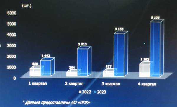По информации, предоставленной АО «ППК», о продажах новых транспортных средств на основе данных об их передаче владельцам декабрь 2023 года ознаменовался увеличением уровня продаж на 84,6 %, или на 59 083 штуки по сравнению с декабрем 2022 года, и составил 128 930 автомобилей. За год рынок вырос на 57,8 % и составил 1 127 856 машин.