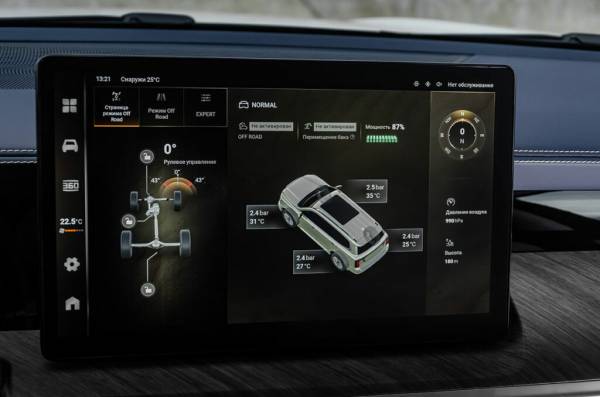 Большой тачскрин «не дружит» со смартфонами через Apple CarPlay и Android Auto — только Bluetooth. Вкладка, посвященная езде по внедорожью, информативна. Сообщит как о блокировках с давлением в шинах, так и об уровне уклона.