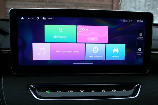 Отсутствие регулировки рулевой колонки по вылету причисляют к главным недостаткам Haval Jolion. Но лично для меня этот нюанс (как и отсутствие регулировки ремней безопасности по высоте) не стал проблемой. Скажем так: все индивидуально. Будь это седан, удобно устроиться за рулем было бы действительно непросто. Но в кроссовере с его высокой посадкой таких проблем не возникает. Центральный дисплей — сердце «Джолиона», куда выведено управление всеми системами, начиная с климат-контроля и заканчивая выбором режимов вождения. Интерьер с минимумом физических кнопок смотрится круто, но первое время это будет бесить. При запуске двигателя нельзя сразу включить подогрев сидений или лобового стекла — нужно подождать, пока прогрузится меню. К счастью, загружается система быстро, а свайп вправо по экрану сразу открывает доступ к самым важным настройкам. Плюс под экраном есть отдельные «горячие» сенсорные кнопки, откуда, к примеру, можно включить рециркуляцию воздуха в салоне. Кстати, переведено меню отлично, да и графика радует глаз.