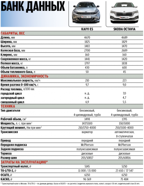 В битве багажников Skoda выигрывает по умолчанию. Как ни крути, а огромный проем имеет значение, кроме того, чехи обещают, что сюда войдет 600 литров поклажи. Мы проверили и смогли уложить под шторку всего 484. Это очень хороший результат, но расхождение с обещанием тоже заметное. Китайцы намного скромнее, они рассчитывают уложить в свой багажник 430 литров, и это правда. У нас вошло 420. Причем инженеры «Кайи» постарались выжать из возможностей седана максимум, для этого вынесли петли наружу, и теперь, укладывая вещи, не нужно думать, закроется крышка нормально или своими огромными петлями помнет вещи. Кроме того, у Е5 есть потенциал для роста. Пластиковый пол установлен на проставках высотой 5–7 см, и если их удалить, можно будет погрузить вещей примерно как в «Октавию», но с поправкой на то, что размер проема у седана все-таки заметно ограничен.