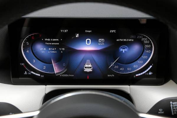В целом интерьер воспринимается классически сдержанным, без эксцессов. Мягкий верх торпедо прекрасно сочетается с жестким светлым низом, сделанным на удивление аккуратно: и не заметишь, что это пластик, пока не попробуешь на ощупь. Простой, лаконичный и очень удобный селектор АКП так и просится в руку. Вполне информативная и логичная цифровая приборная панель с классическими циферблатами напоминает планшет, установленный на торпедо. Широкий центральный подлокотник скрывает глубокий емкий бокс с мягкой обивкой и съемным ящичком для салфеток, розеткой на 12 вольт и USB-разъемом. Все здесь, согласно идеалам развитого социализма, «во имя человека, все для блага человека»: макияжные зеркала с подсветкой в козырьках, очечник сверху, тайничок-бокс слева от руля, вместительный, отделанный велюром перчаточный ящик.
