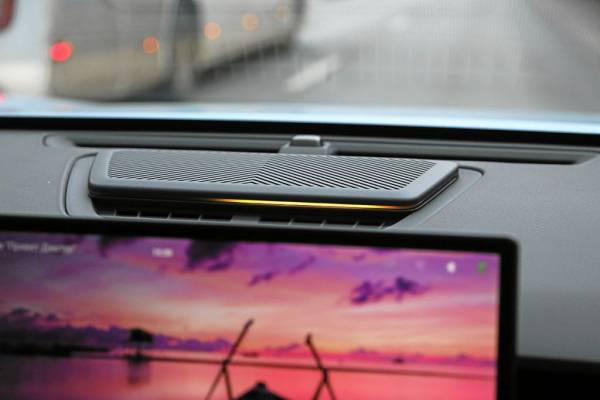 Узкая полоска приборной панели — одно из спорных решений дизайнеров. Особенно рядом с огромным дисплеем, на котором нарисованы горы.