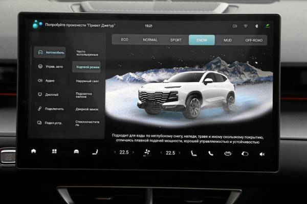 Точно так же, как в Сhery, в трансмиссии полноприводного Dashing предусмотрено полдюжины режимов. Три шоссейных — «Эко», «Комфорт», «Спорт» и три внедорожных — «Снег», «Грунт» и «4×4». С первыми тремя все ясно: в экономичном машина становится крайне меланхоличной, в спортивном — более резкой и нервной, но не более быстрой. Так что я довольно скоро остановился на оптимальном «Комфорте». С остальными интереснее.