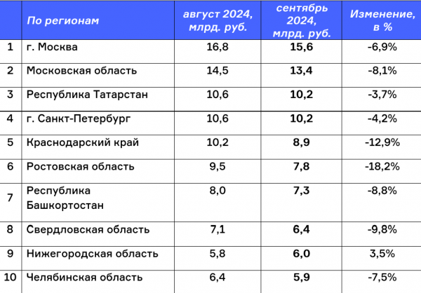 Среди регионов, в которых в первый осенний месяц года был зафиксирован наибольший объем выданных кредитов на приобретение автомобиля, лидируют Москва (15,6 млрд. руб.), Московская область (13,4 млрд. руб.), Республика Татарстан (10,2 млрд. руб.), Санкт-Петербург (10,2 млрд. руб.) и Краснодарский край (8,9 млрд. руб.).