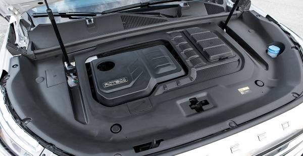 VX собран на универсальной платформе M3X, созданной немецкой компанией Benteler. Она подходит и для легковых автомобилей с гибридной установкой. Турбированный 2‑литровый двигатель TGDI, дефорсированный до экономически целесообразных 249 л. с., обладает крутящим моментом 385 Нм и агрегатируется с роботизированной 7‑ступенчатой коробкой передач Getrag. Подвеска McPherson спереди, независимая многорычажка сзади. Если под 20‑дюймовыми колесами ровное асфальтовое покрытие, VX стартует достаточно уверенно, не выходя из заявленных 8,5 секунды до 100 км/ч, чего инстинктивно не ожидаешь. Раскачка кузова в поворотах при относительно спокойной езде не превышает значений, после которых начинаешь гасить раздражение. Да и система удержания в полосе работает не с филигранной точностью, чуть «побалтывает», но усердно возвращает автомобиль на нужную траекторию. А вот неожиданная неровность или лежачий полицейский отдаются резким толчком в позвоночном столбе, несмотря на удобные передние кресла с «полноразмерной» подушкой. Когда покрытие меняется, VX едет предсказуемо, и акустическая обстановка в салоне комфортная, думаю, благодаря дополнительной дилерской шумоизоляции, которой проложили пороги и днище — с заводским комплектом, скорее всего, было бы печальнее. В горах при только что выпавшем снеге VX на уклоне около 30 % упорно отказывался забираться вверх, зато вниз при включенной системе спуска сошел, можно сказать, идеально. Заявленный клиренс составляет внушительные 20 см. Но защита патрубков системы охлаждения «съедает» по меньшей мере 3 см. С этой проблемой обещали разобраться. Электронные блокировки на автомобиле отсутствуют, да и не предназначен он для тяжелого бездорожья, а полный привод здесь служит для уверенного трогания с места и устойчивости на зимней дороге.