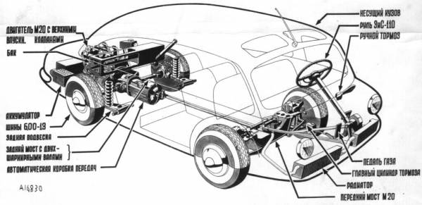 Поскольку запланированные совершенно новый мотор и трансмиссию предстояло доводить до ума, на машину поставили двигатель от «Победы». Но, все-таки, не стандартный, а переделанный в верхнеклапанный и форсированный до 63,5 л. с. То есть — гораздо мощнее серийного 50‑сильного агрегата ГАЗ-М20.